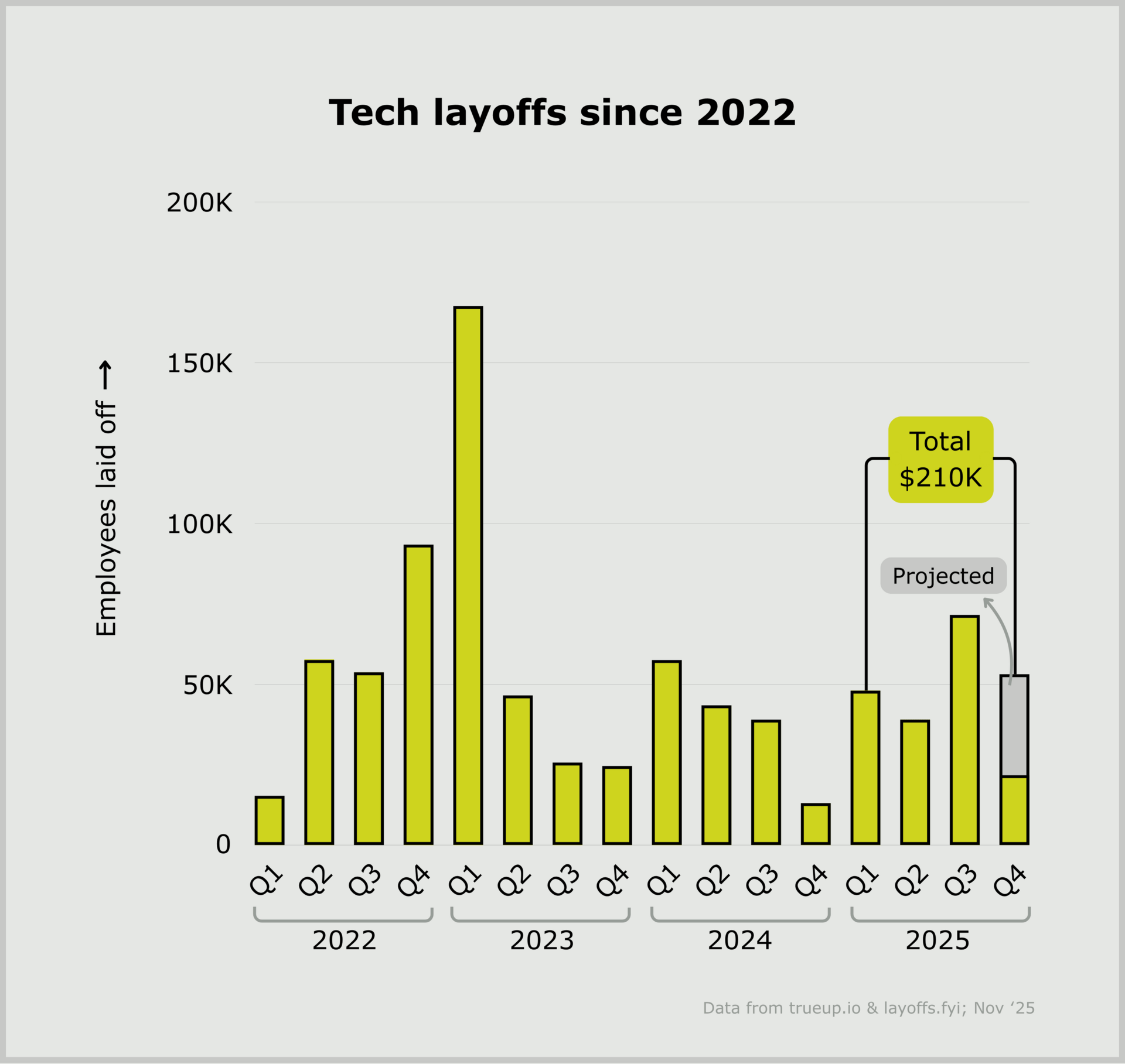 > total layoffs since 2022 ≈819K; 2025 YTD ≈178.6K (100K US alone)