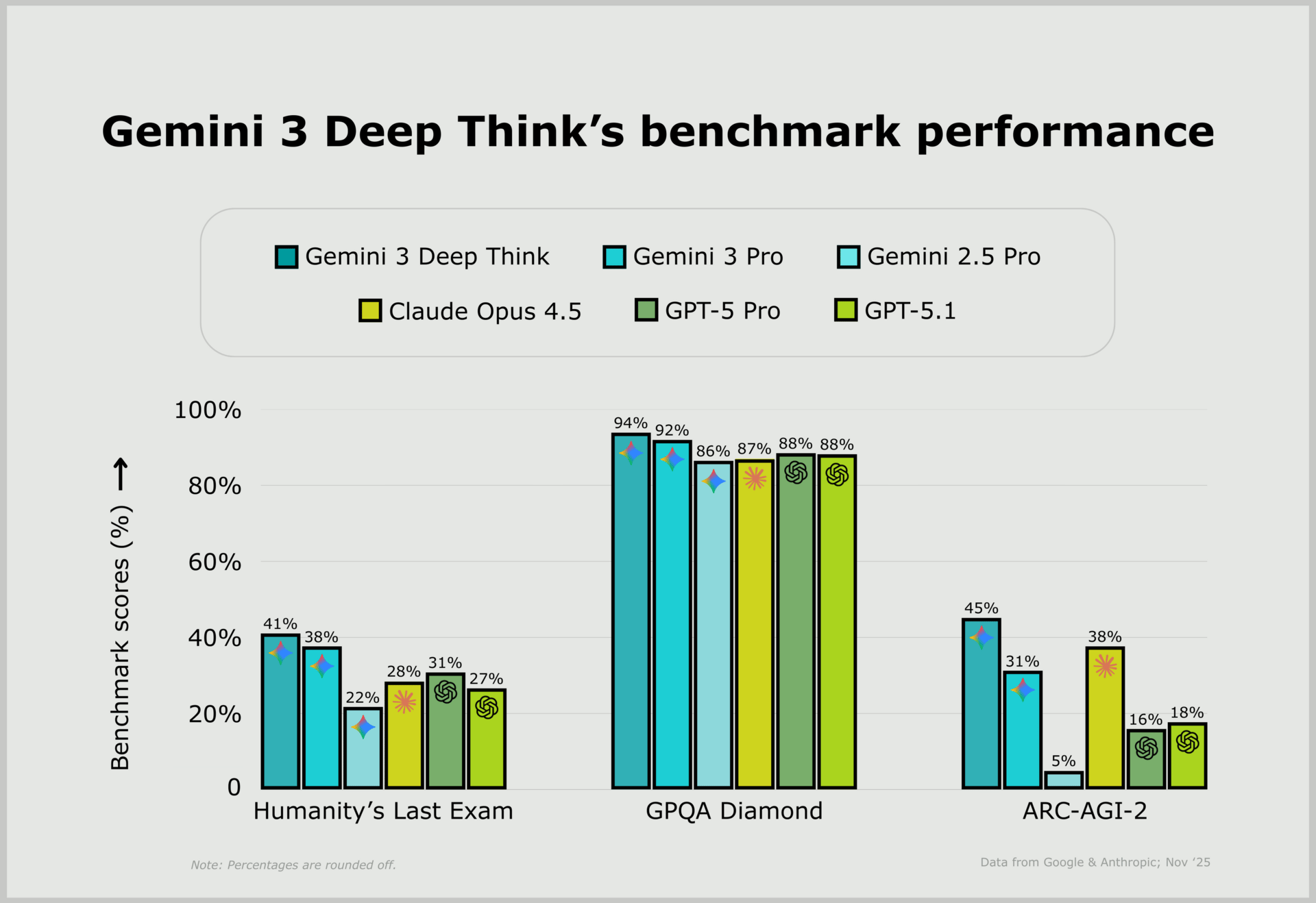 > first model to cross 40% on both HLE (without tools) & ARC-AGI 2