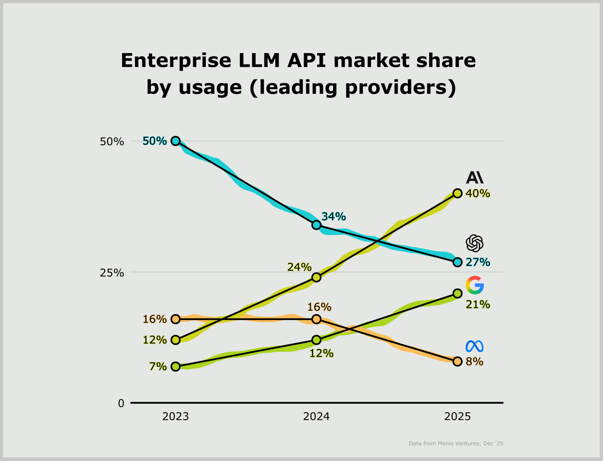 > OpenAI & Google follow at ~21% & ~11% respectively