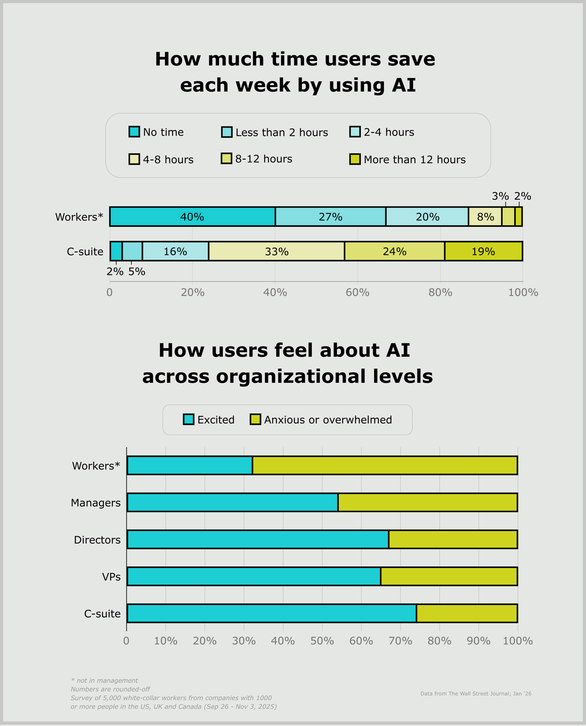 > C-suite claims much higher time savings from AI than workers, latter report far less
