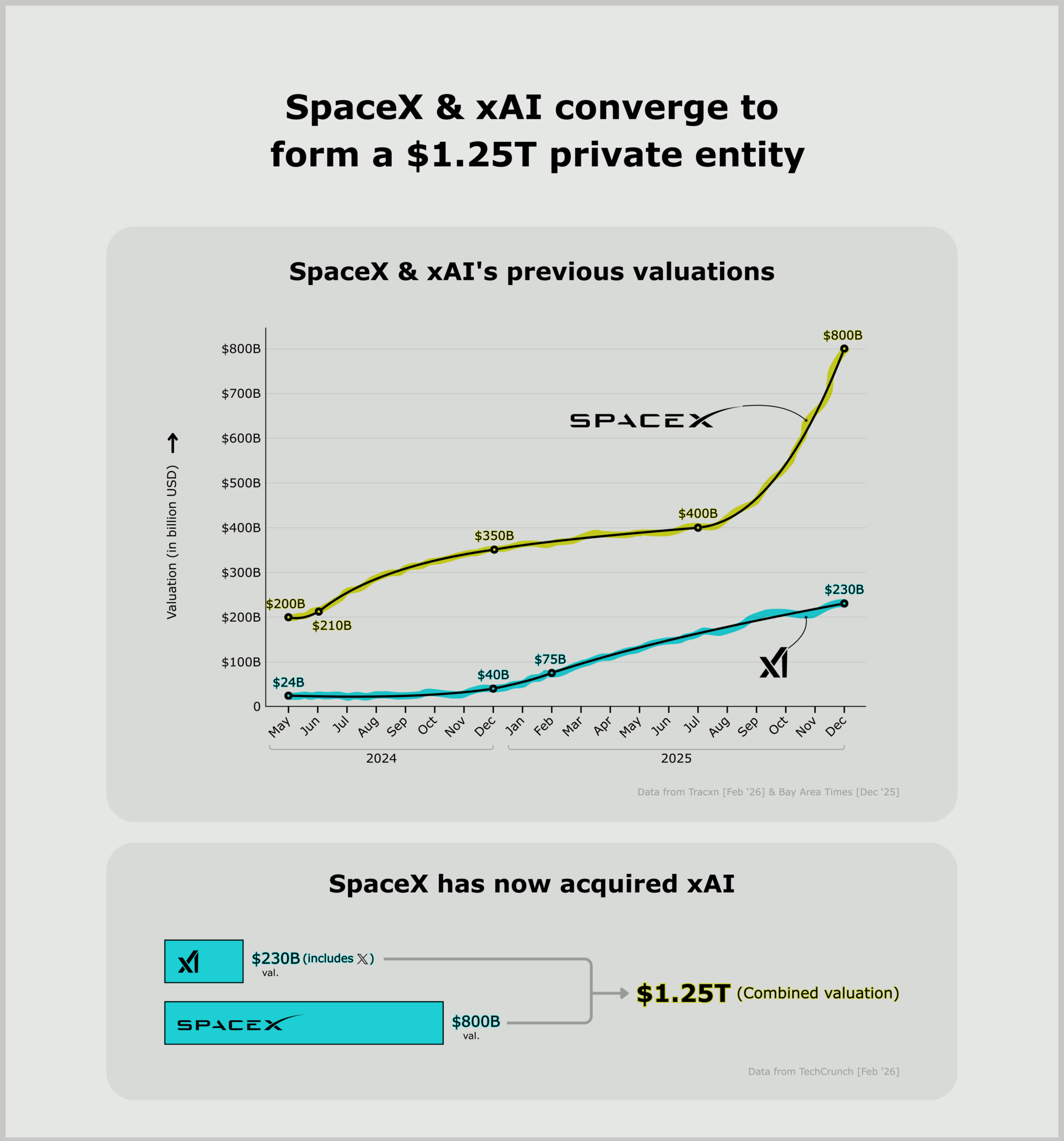 > X + xAI merged last year, both + SpaceX now → most valuable private entity, beating OpenAI before IPO later this year